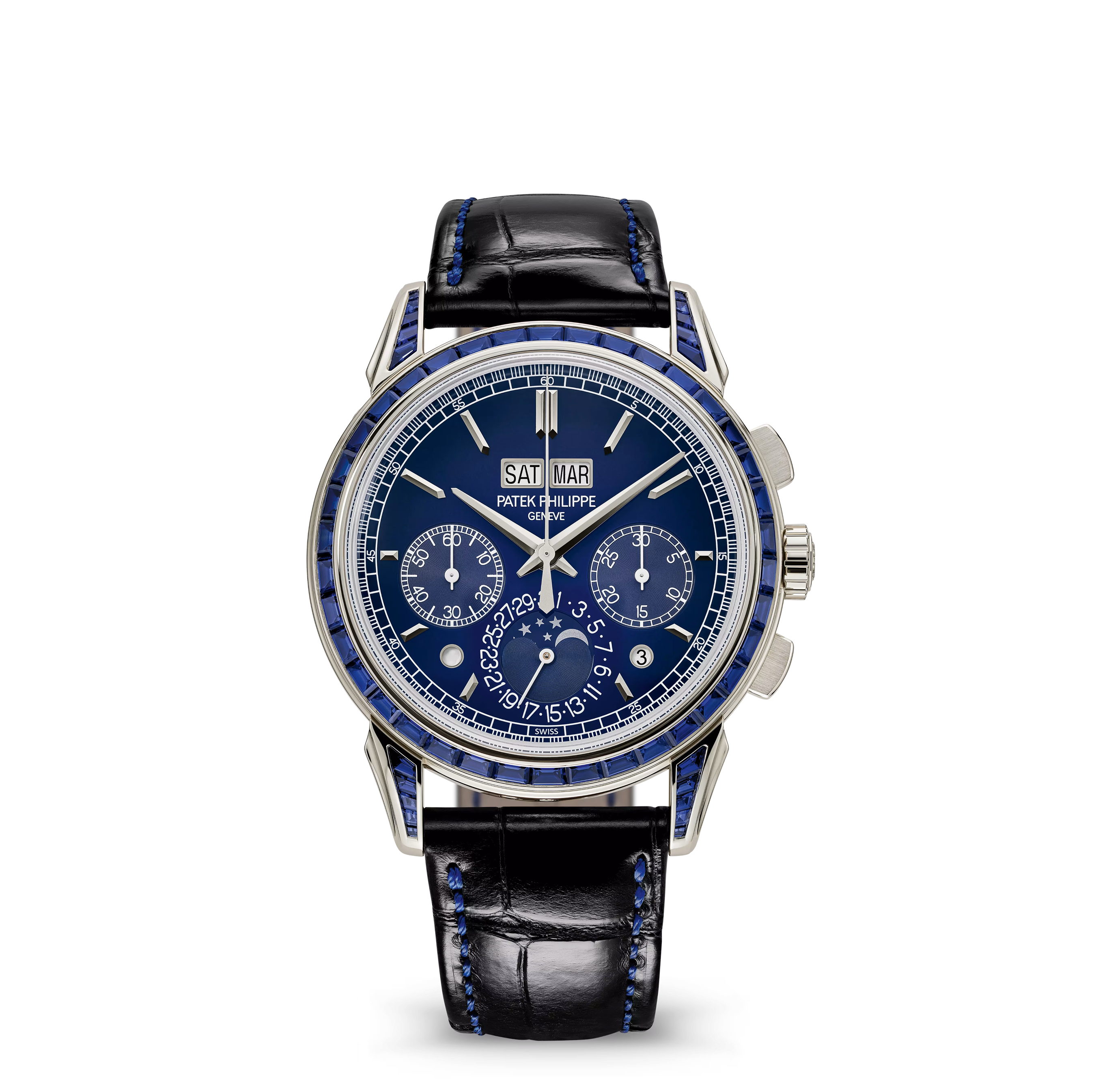 Patek Philippe Grand Complications 5271/11P-010 — исключительная модель с вечным календарем и хронографом в платиновом корпусе. Лакированный синий циферблат с черным градиентным ободком гармонично сочетается с багетными синими сапфирами, украшающими безель и ушки.