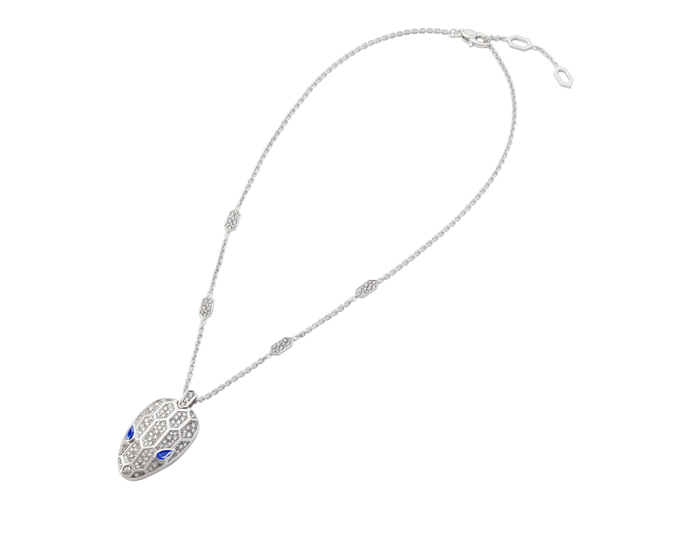 Колье выполнено из 18-каратного белого золота, украшено бриллиантами pavé общим весом 2,07 карата и сапфировыми глазами насыщенного синего оттенка весом 0,78 карата. Длина цепочки регулируется 41–43 см. Модель подлежит изменению.
